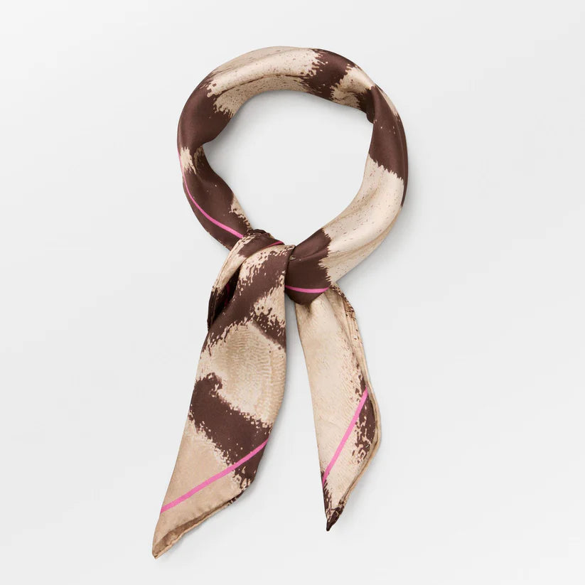 Graphia Tenia Sia Cream and Brown from Becksöndergaard is a square scarf measuring 65 x 65 cm, made from 100% silk. The graphic pattern creates a clean, modern look. The lightweight silk feels comfortable against the skin and can be worn around the neck, in your hair or on your bag.