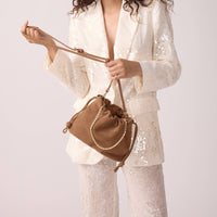 The Tessa bag in tan suede leather captivates with its soft and refined design.