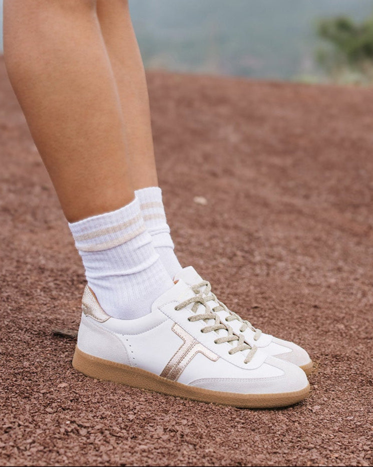 We love the style and the comfort of her sumptuous rubber sole. In cream and gold it's the perfect combination for when you want all day comfort but elevated enough to wear with a smarter trouser.
