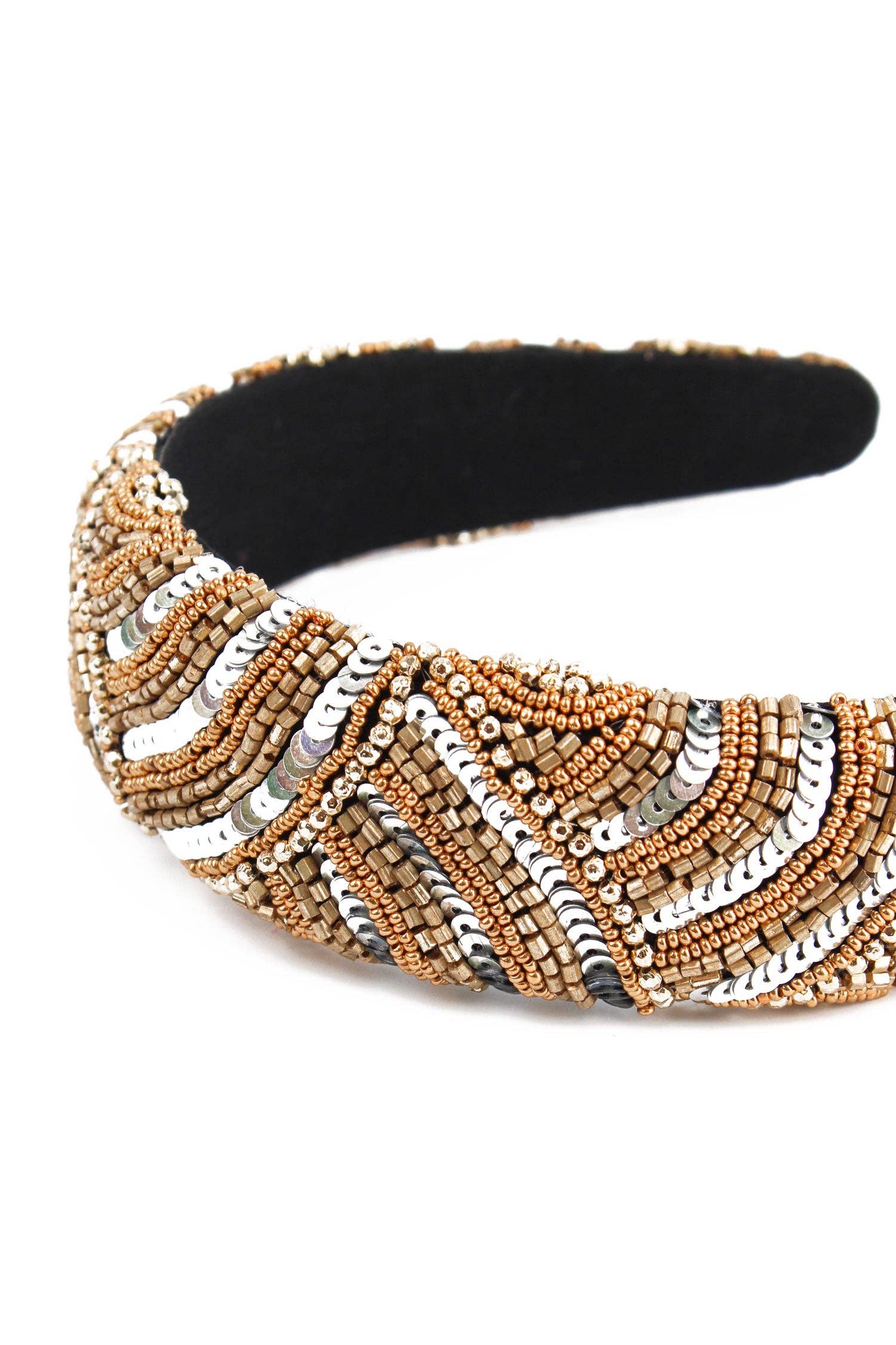 Statement headband, hand-embellished with silver sequins and gold beads in an art deco style.