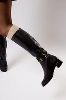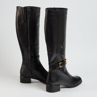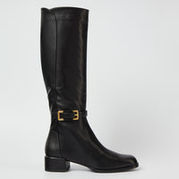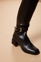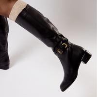 She captures timeless elegance and modern edge in one refined silhouette. Crafted from supple black Italian leather, this knee-high boot offers a luxurious feel and perfect fit. The gold buckle detail at the ankle adds a touch of sophistication, making Louisa an ideal choice for versatile styling, from chic everyday wear to polished evening looks!