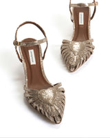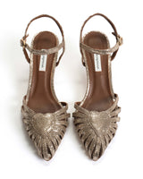 Pair this neutral metallic champagne slingback with this season's blacks, browns, beiges, nudes, soft pinks, khaki green and creams.